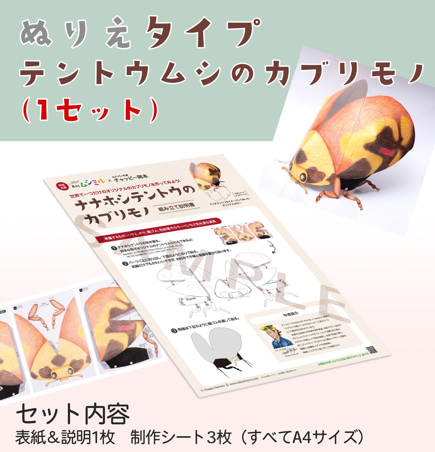 カブリモノ作家チャッピー岡本とムシミルのコラボアイテムです。テントウムシのカブリモノを作ることができます。一人で、家族で、イベントにどうぞ!